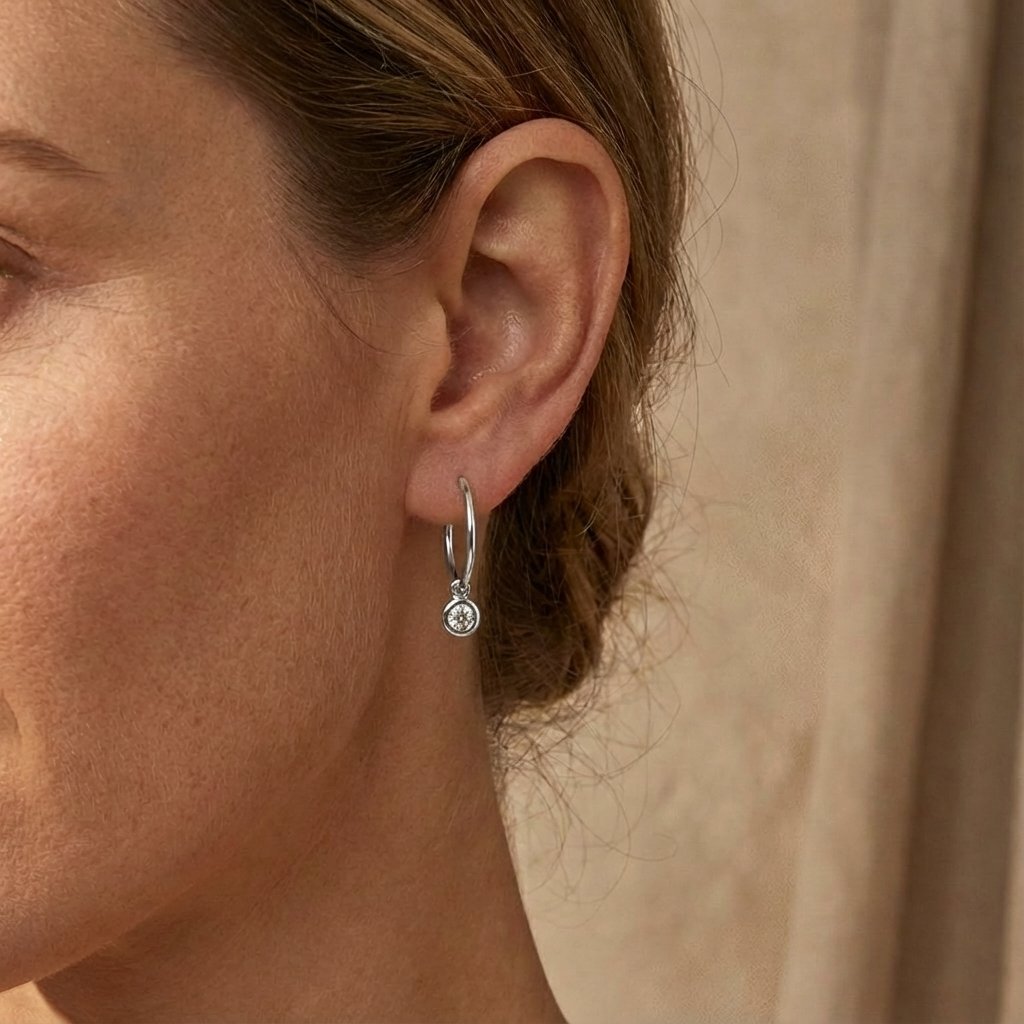 Vyvážený tvar, který září s lehkostí. Kruhové náušnice Sweetie ve střední velikosti z 14karátového bílého zlata nabízejí dokonalý balanc mezi jemností a sebevědomým výrazem. Volně zavěšený brilantně broušený laboratorní diamant dodává šperku pohyb, jiskru a pocit vzdušnosti. Právě tahle velikost je ideální, pokud hledáte výraznější, ale stále každodenně nositelný šperk. Minimalistický kruh v kombinaci s diamantovým přívěskem tvoří elegantní celek, který snadno doladíte ke sportovnímu saku i večerním šatům.