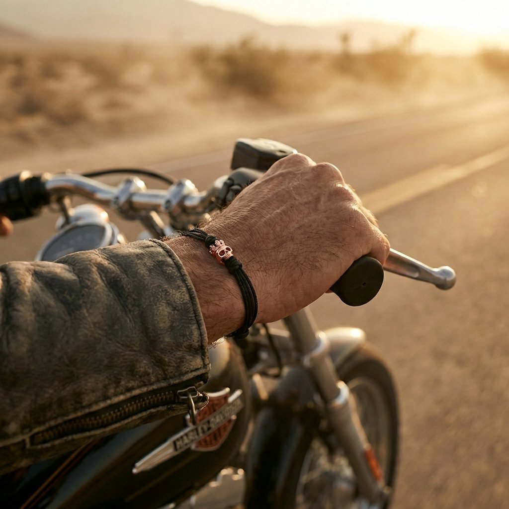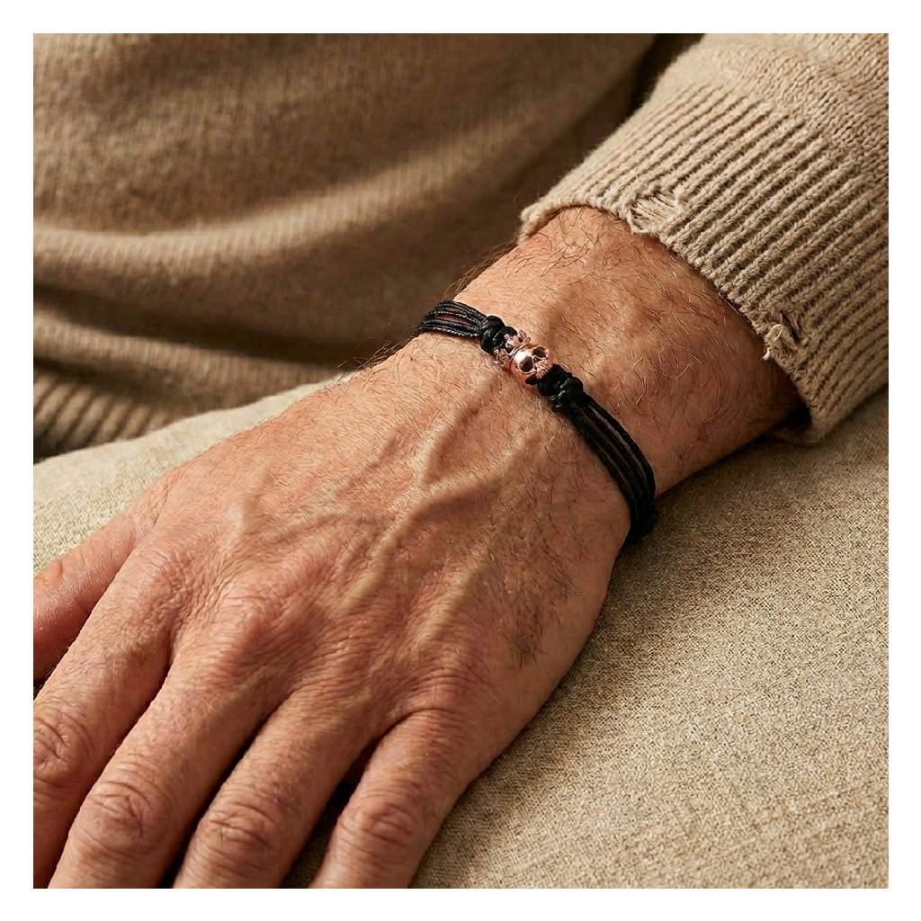 Dominantou náramku je precizně zpracovaný přívěsek ze 14kt růžového zlata ve tvaru lebky s korunou. Lebka symbolizuje odvahu, pomíjivost a pravdivost, zatímco koruna představuje sílu, respekt a vnitřní autoritu. Spojení těchto prvků vytváří jemnější, ale stále výrazný design, který nepůsobí křiklavě ani okázale. Je to šperk pro muže, kteří chtějí zaujmout designem a myšlenkou, ne leskem.