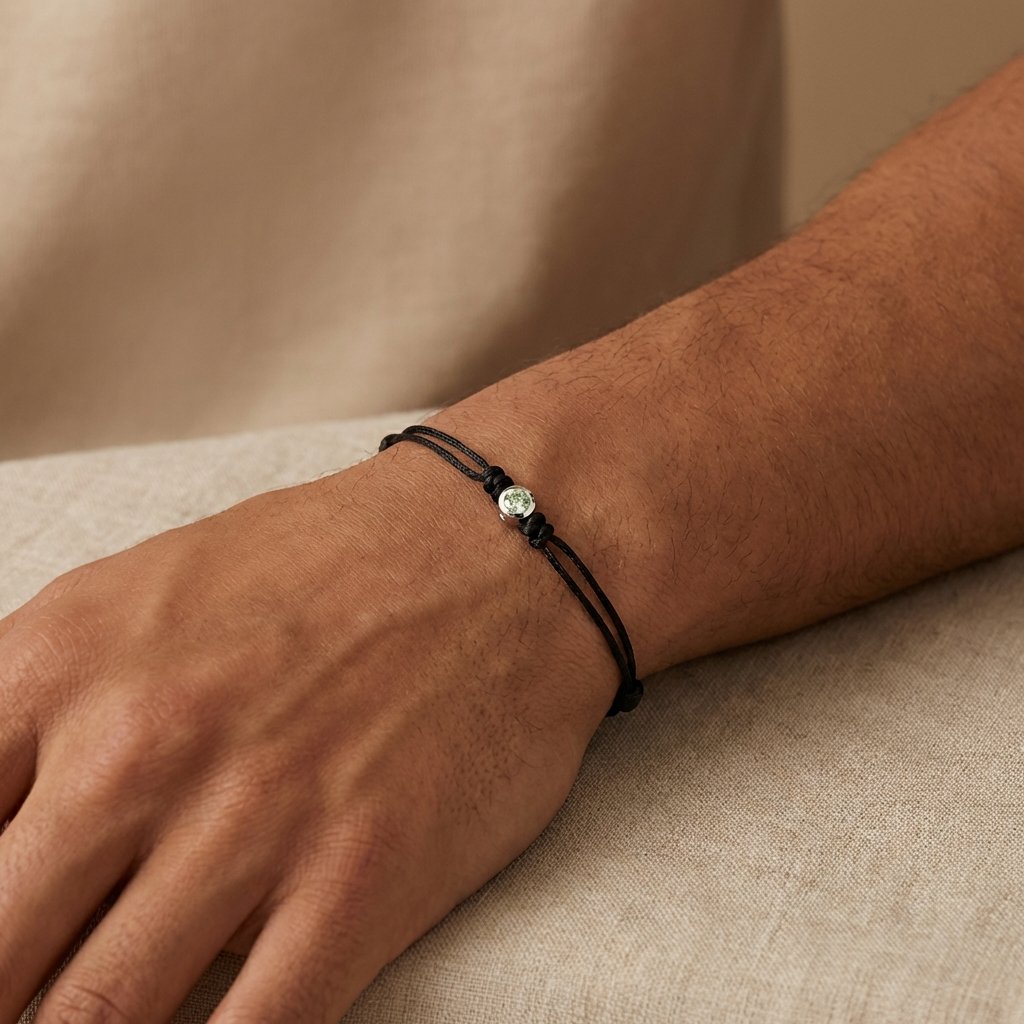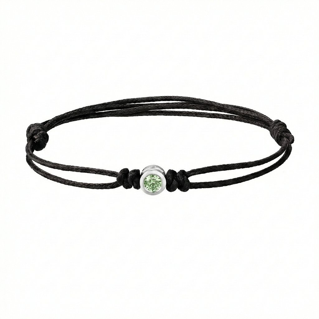 Pánský náramek Round se skládá z přívěsku z bílého 14kt zlata, kterému dominuje úžasně zelený laboratorně vyrobený diamant s kulatým výbrusem o celkové hmotnosti 0,16 ct. Přívěsek je upevněn na nylonové šňůrce Micro Cord 1.18 mm od americké společnosti Atwood Rope. Tento vysoce kvalitní a pevný materiál vydrží pevnost v tahu až 45 kg. Je trvanlivý, odolává plísním, UV záření a je barevně stálý. Jeho velikost lze upravit dle potřeby pomocí speciálních posuvných uzlů.