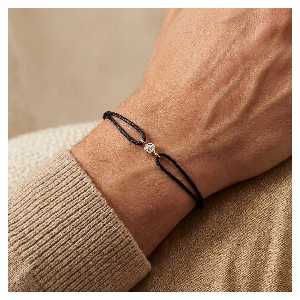 Provázkový náramek Sweetie Grandi nejen jemně a elegantně zvýrazní pánskou ruku, ale dokonale doplní pánský outfit. Kulatý tvar tohoto kouzelného náramku z růžového 14kt zlata symbolizuje dokonalost. Pokud hledáte nadčasový a minimalistický šperk pro muže, tento šňůrkový náramek je pro vás tou správnou volbou. Design náramku Sweetie Grandi tvoří výrazný laboratorní diamant s kulatým výbrusem o celkové hmotnosti 0,16 ct, který je zasazen do 14kt zlata. Zlatý přívěsek je upevněn na dvojité nylonové šňůrce. Jeho velikost lze upravit dle potřeby pomocí speciálních posuvných uzlů.