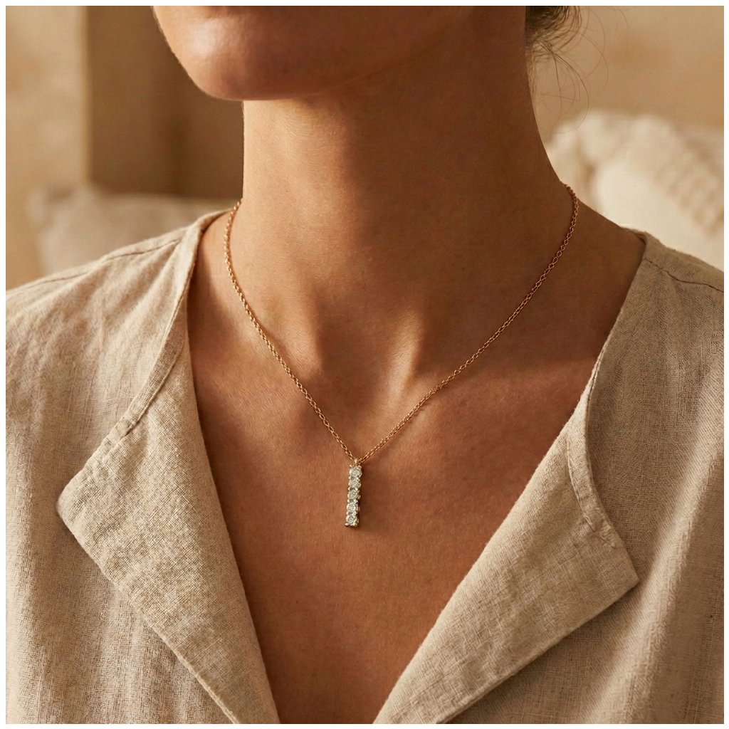 Přívěsek Pure Line 5 je ručně vyráběn z 14k růžového zlata a osazen pěti laboratorními diamanty o celkové váze 0,35 ct(5 × 0,07 ct). Diamanty s barvou E a brilantním brusem jsou zasazeny s maximální přesností, aby naplno vynikl jejich přirozený lesk i čistota. Promyšlené uchycení kamenů umožňuje, aby byly viditelné z každého úhlu – vytvářejí tak jemnou linii světla, pro kterou jsou šperky TIAMI typické.