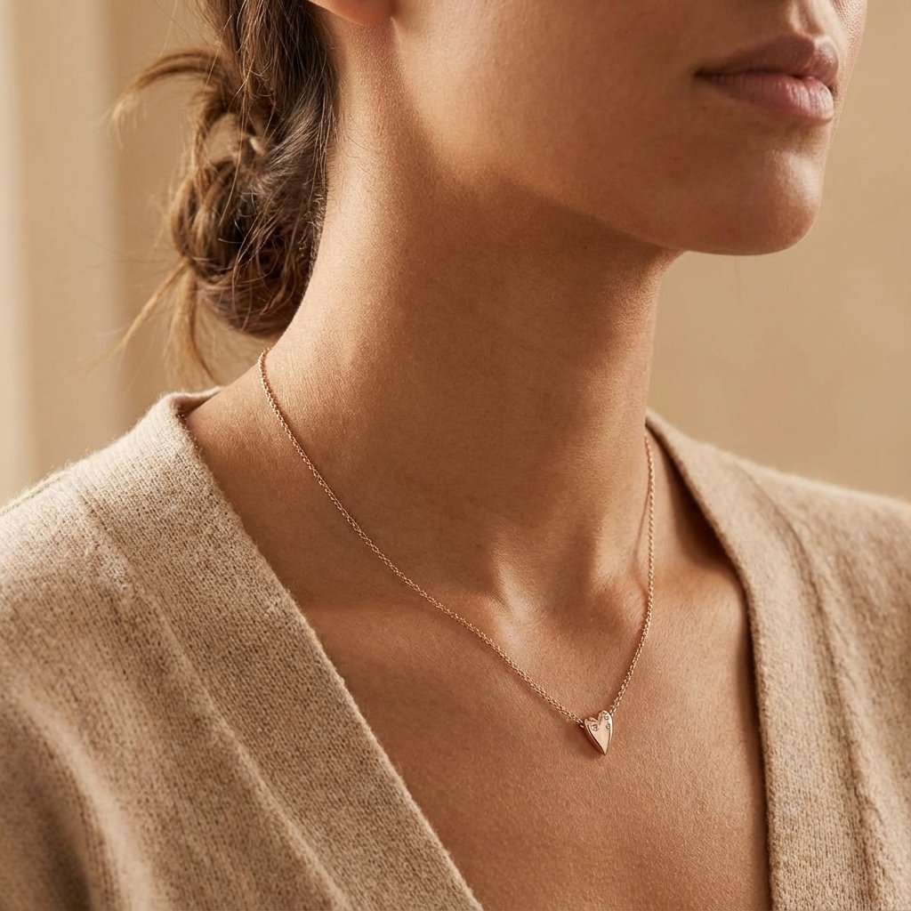 Hlavním motivem tohoto zlatého náhrledníku je ručně vytvořené srdce, jehož povrch je dekorován třemi překrásnými lab-grown diamanty s dokonalou brilancí. Jejich celková karátová hmotnost je 0,04 ct.