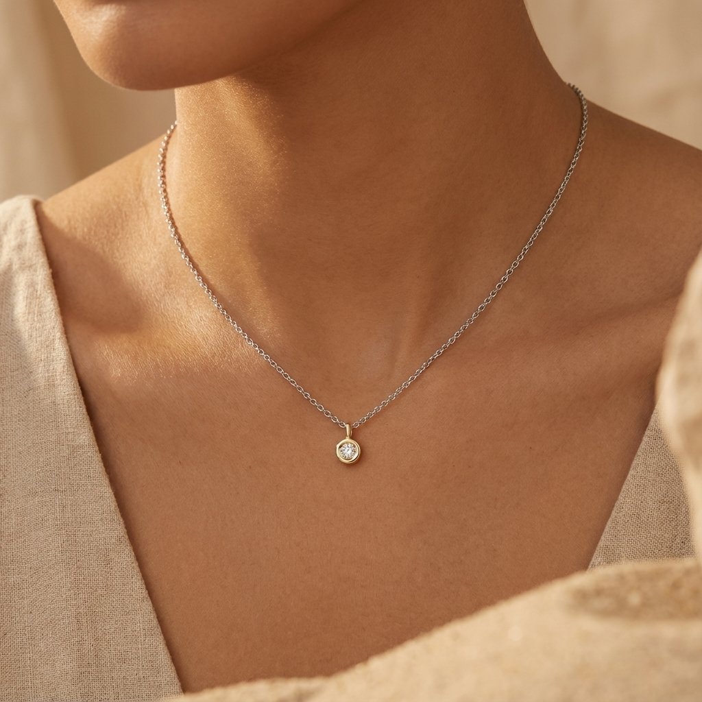 Design jemného přívěsku tvoří výrazný lab-grown diamant s kulatým výbrusem o celkové hmotnosti 0,15 ct, který je zasazen do 14karátového bílého a žlutého zlata. Přívěsek je zavěšen na řetízku o délce 42 cm.