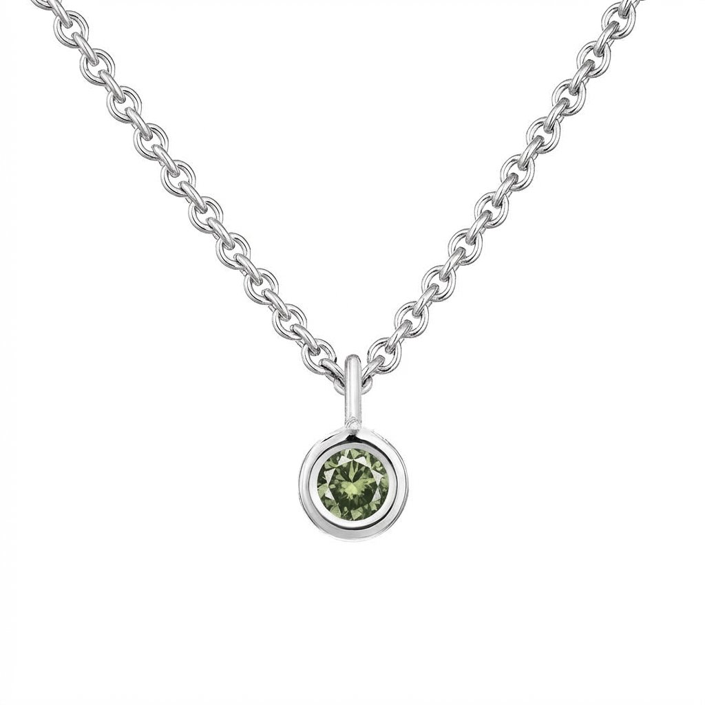 Přívěsek z 14karátového bílého zlata nese kulatý zelený diamant o hmotnosti 0,15 ct, který zaujme svou brilancí i jemným leskem. Zavěšený na řetízku o délce 42 cm se stane vaším každodenním společníkem, připraveným doplnit jakýkoliv outfit.